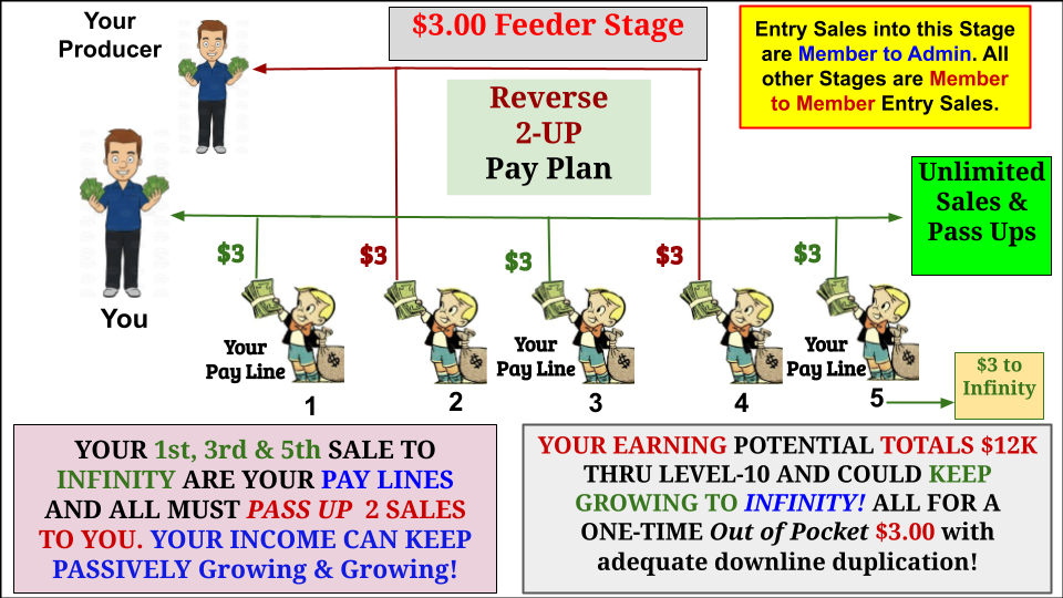 A: Earning with PSIS is simple and easy. PSIS is designed with 11 Reverse (Rvs) 2Up Income Stages. See the Rvs-2Up diagram below which explains how these 11 Stages can grow your income up to $128M through just 10 Levels of each Stage and 90% passively! Each Member begins in the $3.00 Feeder Stage-1 Reverse 2Up by purchasing either the $3.00 Turbo Cash Machine biz oppty or 25 Income Opportunity Seeker Leads from PSIS Admin.